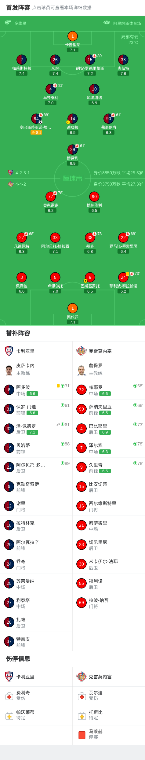 第63分钟,卡利亚里球员泽-佩德罗助攻塞巴斯蒂亚诺-埃斯波西托打入一球。