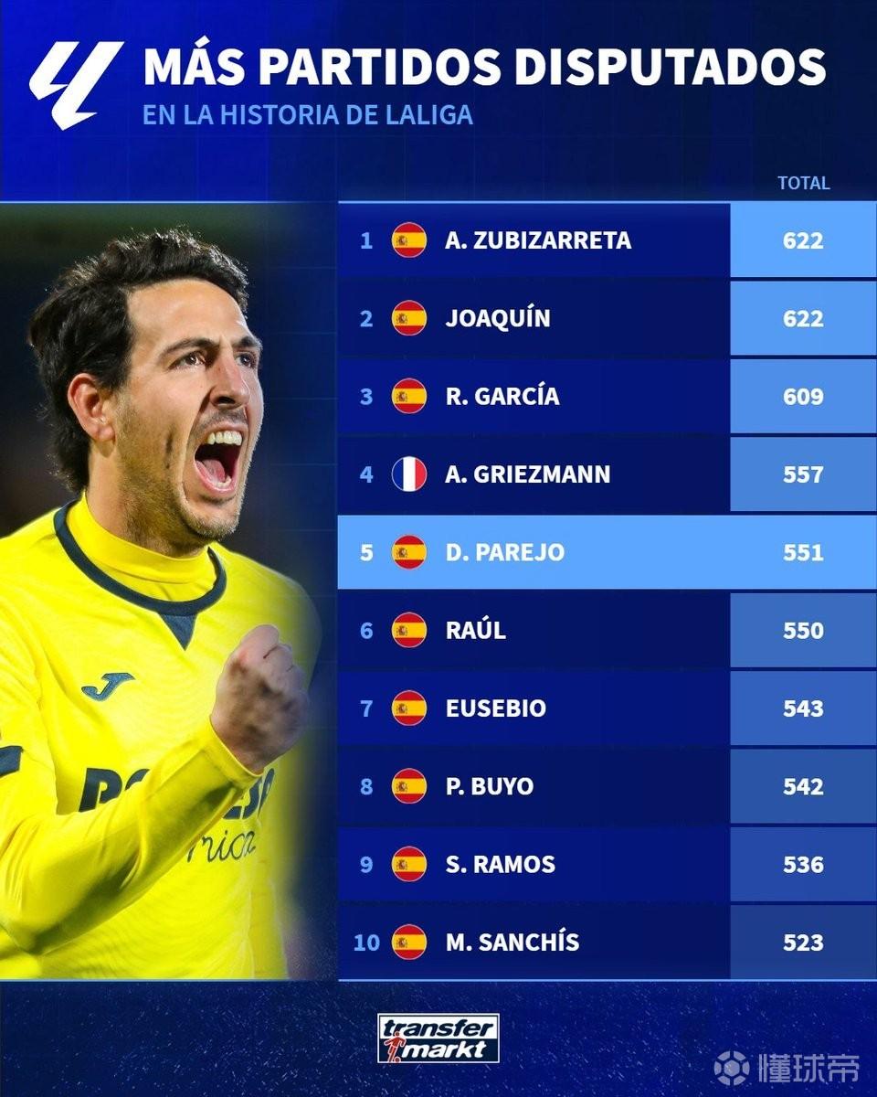 根据德转的统计,本场比赛是帕雷霍生涯至今出战的第551场西甲比赛,他也就此超越了皇马的传奇球星劳尔,成为西甲历史出场次数第五多的球员。