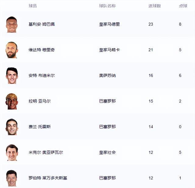 领跑的自然是打进23球的法国巨星姆巴佩(皇马),科索沃锋霸穆里奇(马洛卡)以21球紧随其后。克罗地亚射手布迪米尔(奥萨苏纳)打进16球,西班牙双星亚马尔(巴萨)和费兰·托雷斯(巴萨)分别有15球和14球入账。