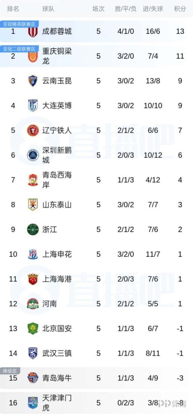中超第5轮结束,目前西南三支球队成都蓉城、重庆铜梁龙、云南玉昆前三,两支东北地区球队大连英博和辽宁铁人紧随其后。
