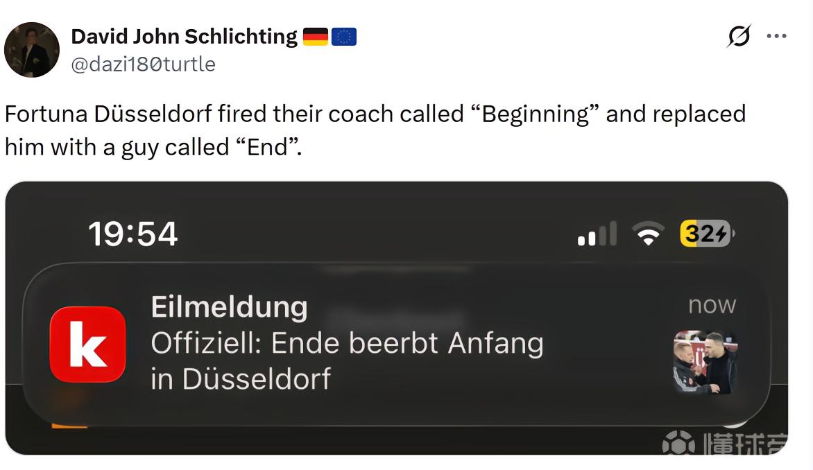 有趣的是,这次换帅的“名字巧合”迅速在德国球迷圈引发热议。由于前主帅安方的名字“Anfang”在德语中意为“开始”,新主帅恩德的名字“Ende”则意为“结束”(也代表末端,结尾),不少球迷在社交媒体和评论区玩起了文字梗: