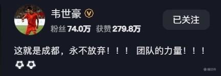 4月12日晚,中超联赛第5轮的一场焦点交锋,成都蓉城客场2-1逆转战胜北京国安。成都蓉城队长韦世豪在社交媒体庆祝赢球:“这就是成都,永不放弃!!! 团队的力量!!!⚽️⚽️”