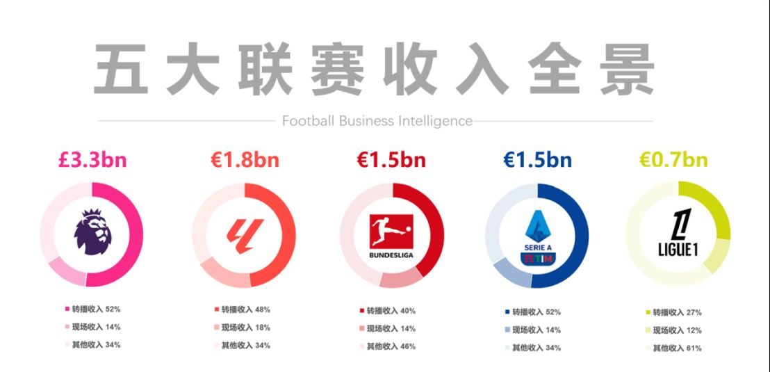 五大联赛23/24赛季现场年观看收入占比 vs 转播收入占比(Deloitte)