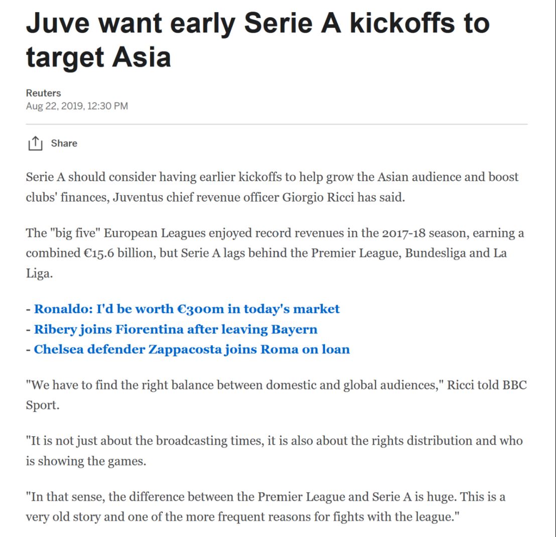 2019年时任尤文图斯首席收入官乔治·里奇表示,意甲应该考虑提前开球,以帮助增加亚洲观众,提高俱乐部的财务状况