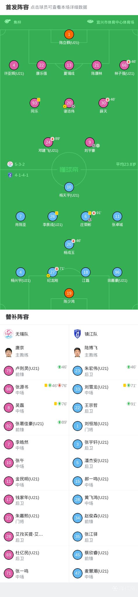 第45+5分钟,刘宇豪弧顶处劲射破门完成双响,无锡2-0镇江