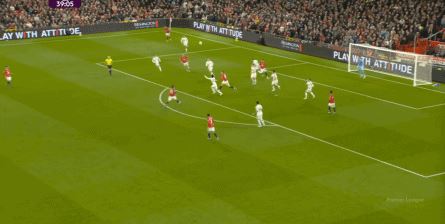 第45分钟,曼联后场出球再出问题,拉门斯和约罗连接失误,就是这一球,又一个该发力解围的球,约罗选择用右脚勉强处理,结果解围不远,刚好落在中间,利兹联又从卡塞米罗身后抢出来,差点就打出了第三球: