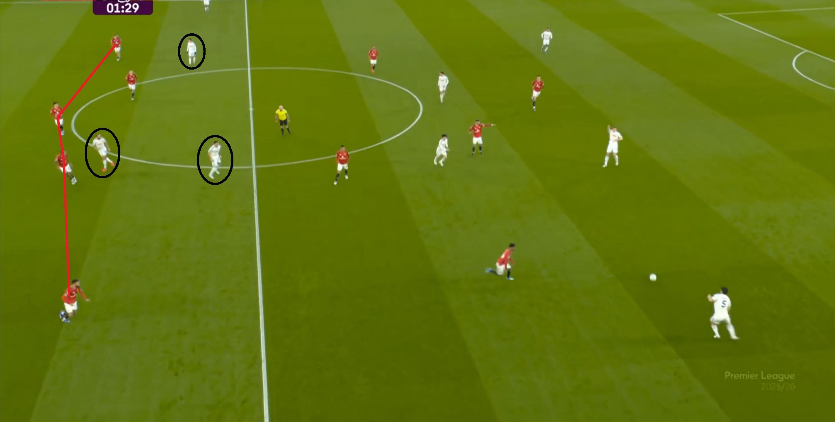 这是难免的事情,毕竟在中卫线上,约罗和利桑德罗-马丁内斯就始终找不到办法来限制勒温的发挥,这一点就让利兹联总有机会把攻势连接到两侧,进而打击曼联的防守宽度问题: