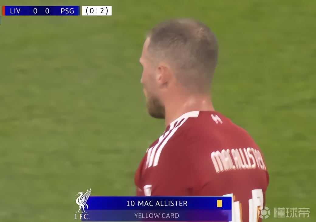 此役主场对阵巴黎圣日耳曼,麦卡利斯特在上半场补时阶段因犯规领到一张黄牌。