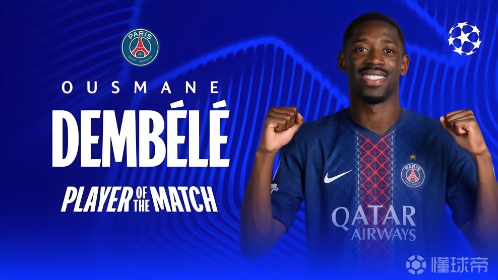 欧冠1/4决赛次回合,巴黎圣日耳曼客场2-0击败利物浦,此役上演梅开二度的登贝莱当选全场最佳球员。