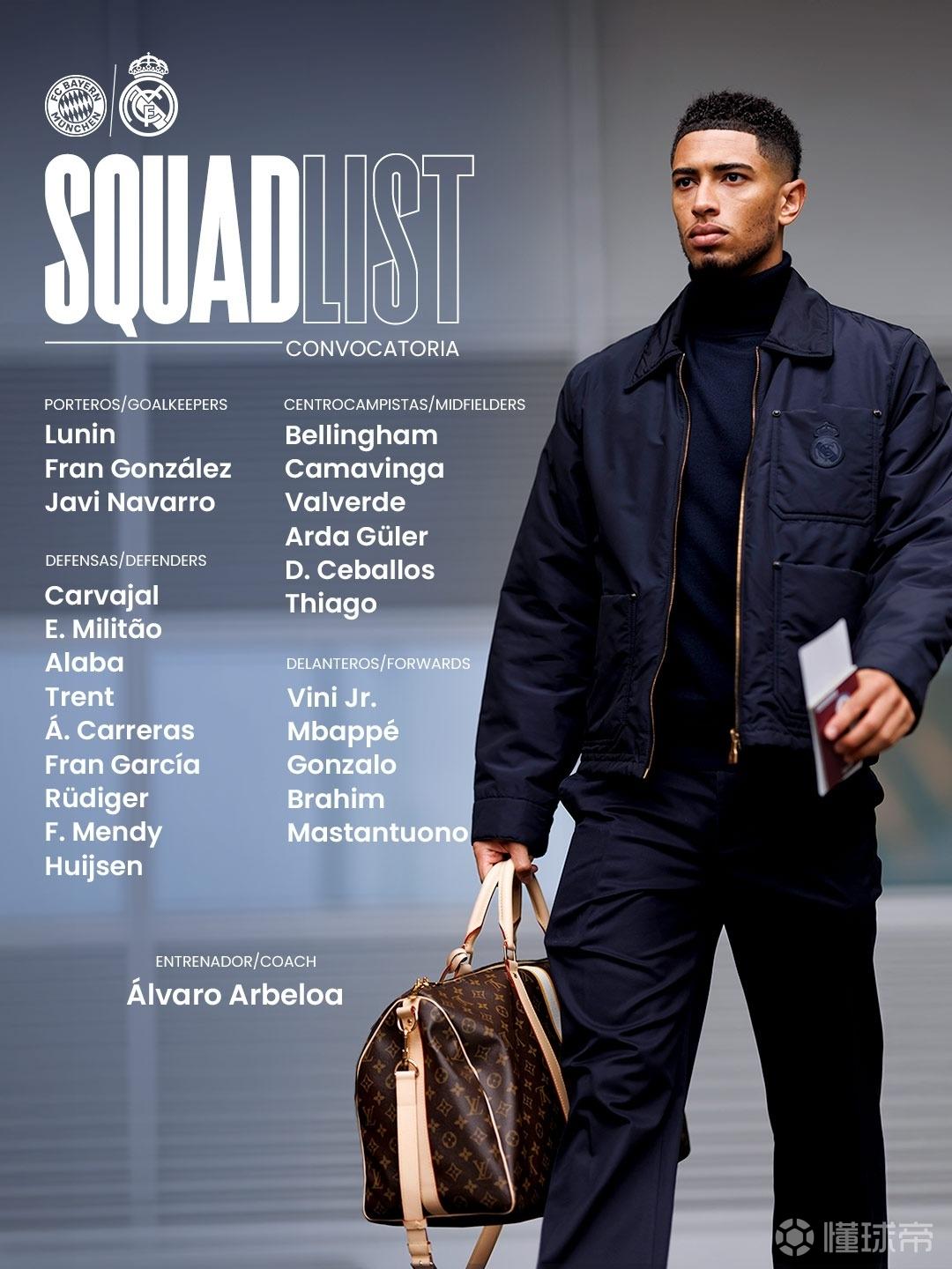 后卫:卡瓦哈尔、米利唐、阿拉巴、阿诺德、阿尔瓦罗-卡雷拉斯、弗兰-加西亚、吕迪格、门迪、赫伊森