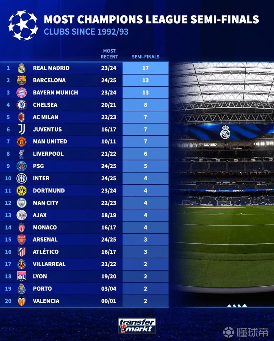 北京时间4月14日,德转列出了自欧冠1992-93赛季改制以来,晋级欧冠半决赛次数最多的20支球队,皇家马德里以17次高居第一,巴塞罗那和拜仁慕尼黑13次并列第二。