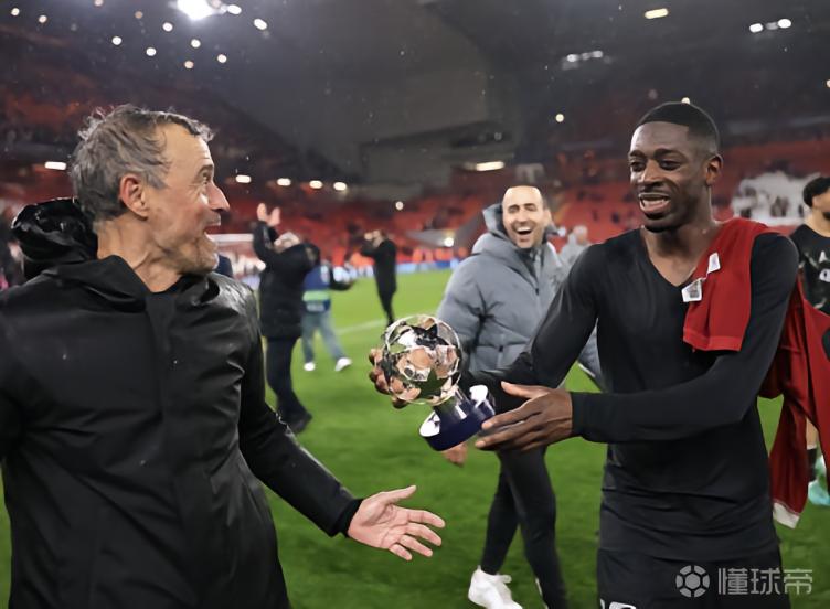 随后,登贝莱将奖杯献给了主教练恩里克,恩里克面带笑容连连摆手。