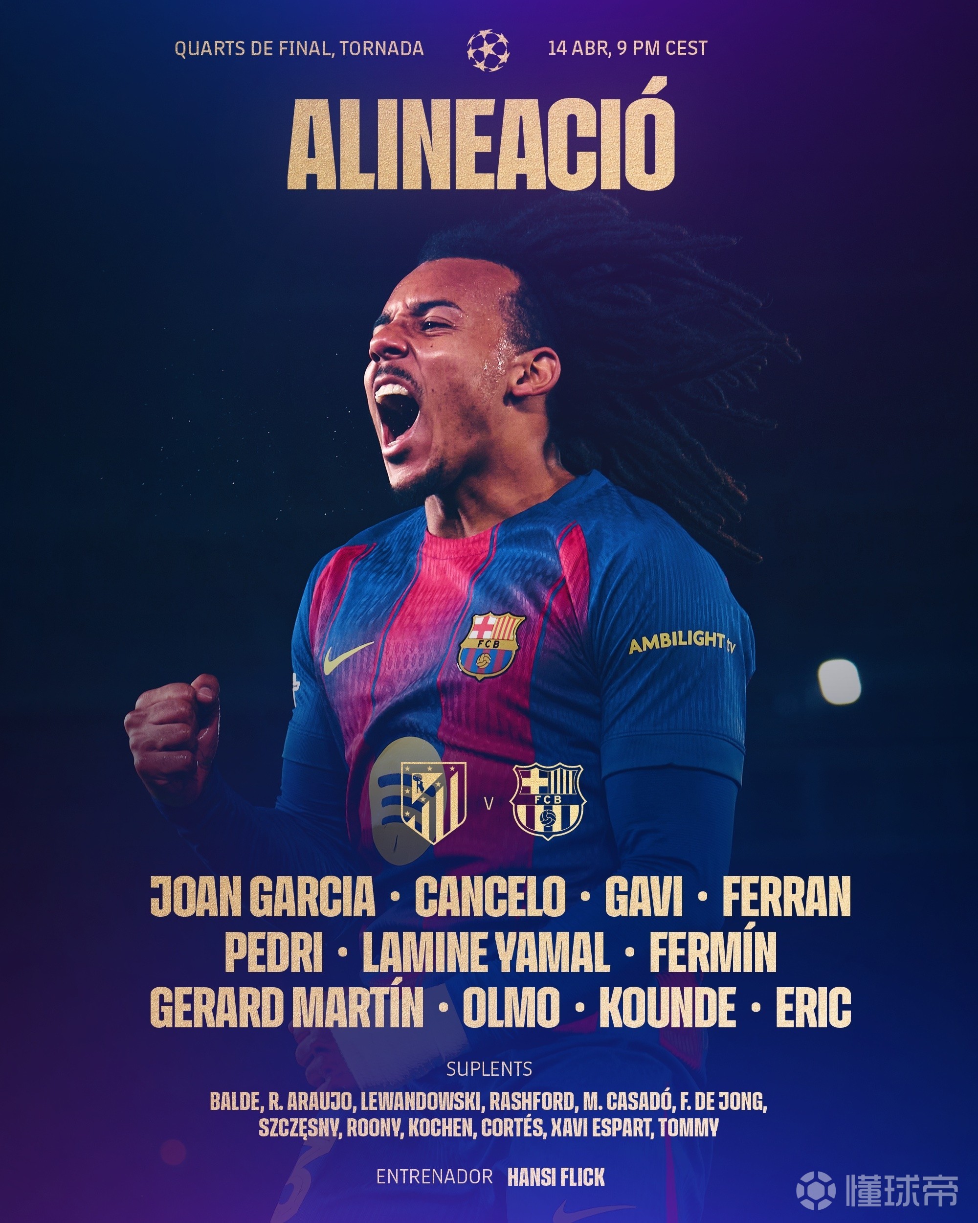 北京时间4月15日3:00,欧冠1/4决赛次回合,马竞坐镇利雅得航空大都会球场迎战巴萨,本场主裁判为蒂尔潘,首回合马竞客场2-0巴萨,赛前双方首发出炉。
