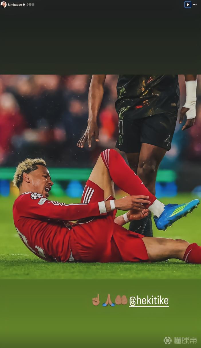 在利物浦的法国前锋埃基蒂克遭受重伤后,姆巴佩在社交媒体表达祝福和祈祷。