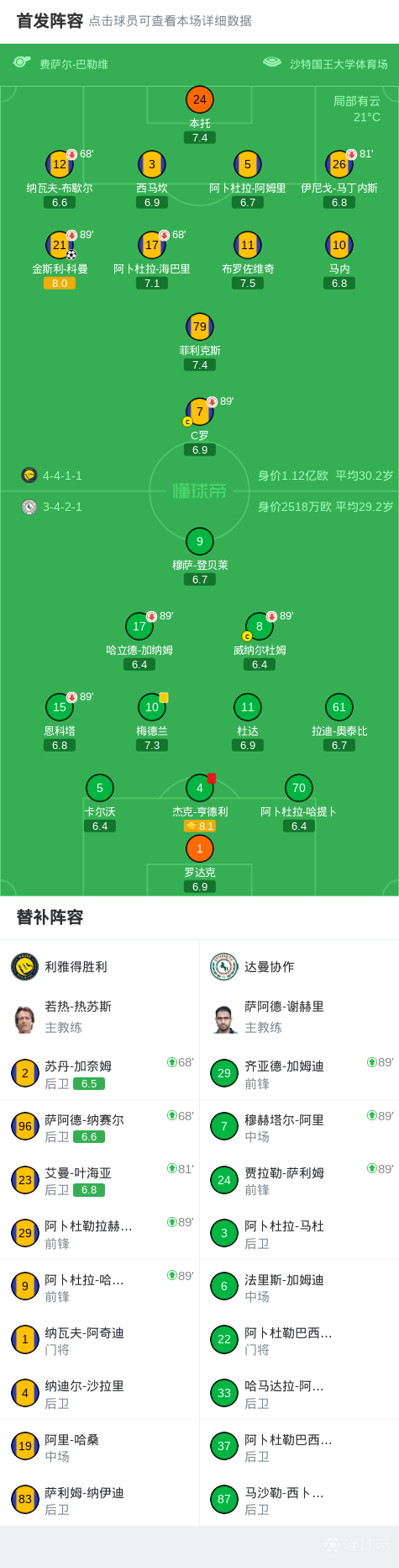 北京时间4月16日2:00,沙特联第29轮,利雅得胜利主场对阵达曼协作。上半场,金斯利-科曼远射打偏,马内禁区内打门被门线解围,半场临近结束,C罗远射被扑出,科曼跟进补射打破场上僵局,随后马内错失单刀机会。下半场,登贝莱脚后跟打门被门将挡出,菲利克斯远射打偏,亨德利染红,最终,利雅得胜利1-0达曼协作,先赛1场以8分优势领跑积分榜。