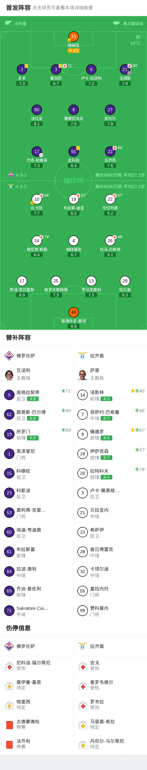 北京时间4月14日意大利足球甲级联赛第32轮,佛罗伦萨主场迎战拉齐奥。上半场戈森斯把握机会打入全场唯一进球。最终佛罗伦萨1-0战胜拉齐奥。