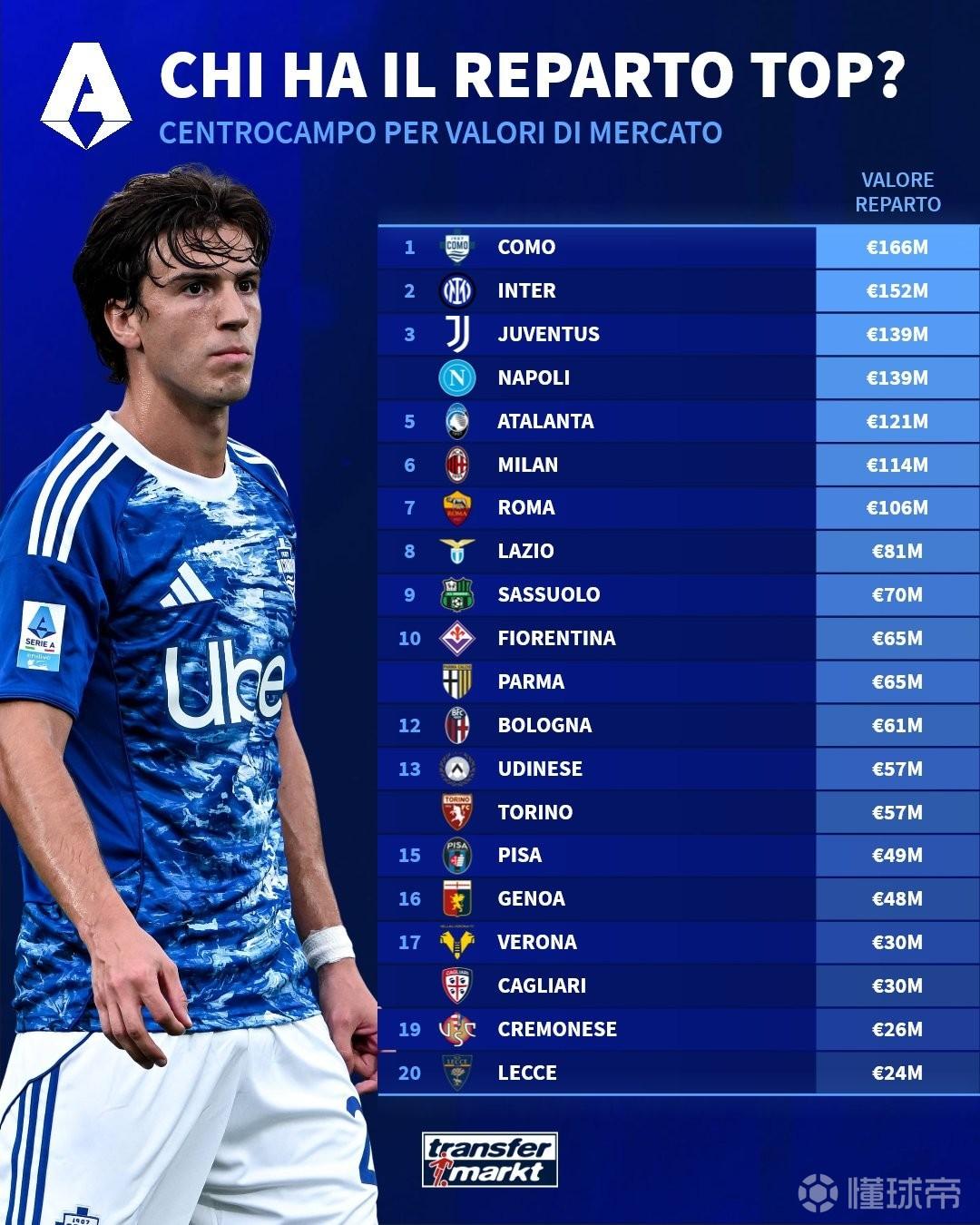 德转列意甲20队中场身价排名: