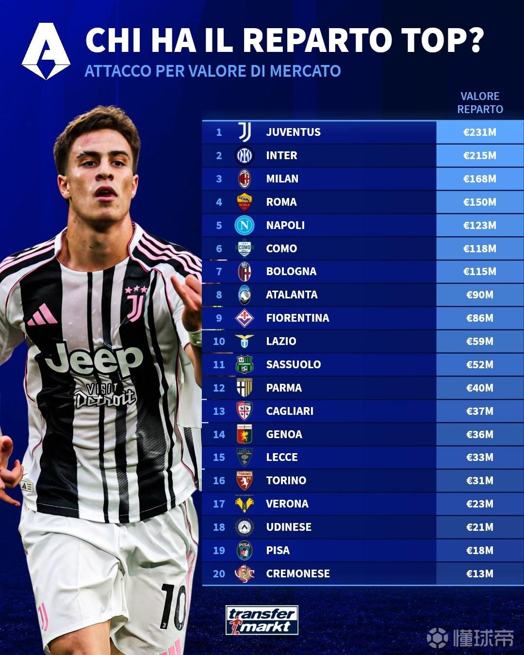 北京时间4月15日,德转统计意甲20队三条线的球员身价排名,防线上国际米兰位列第一,中场科莫领跑,锋线则是尤文图斯身价最高。