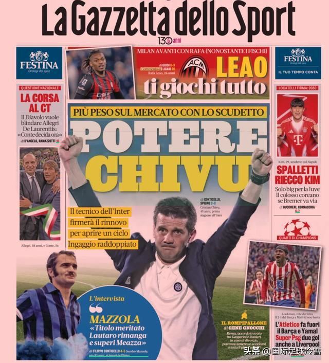 比如《米兰体育报》将齐沃放上封面,指出:赛季结束后齐沃将与国米续约,年薪从税后250万提升到400到500万欧元,接近翻倍。同时,齐沃将在球队建队规划、转会市场决策中,拥有更大的话语权。