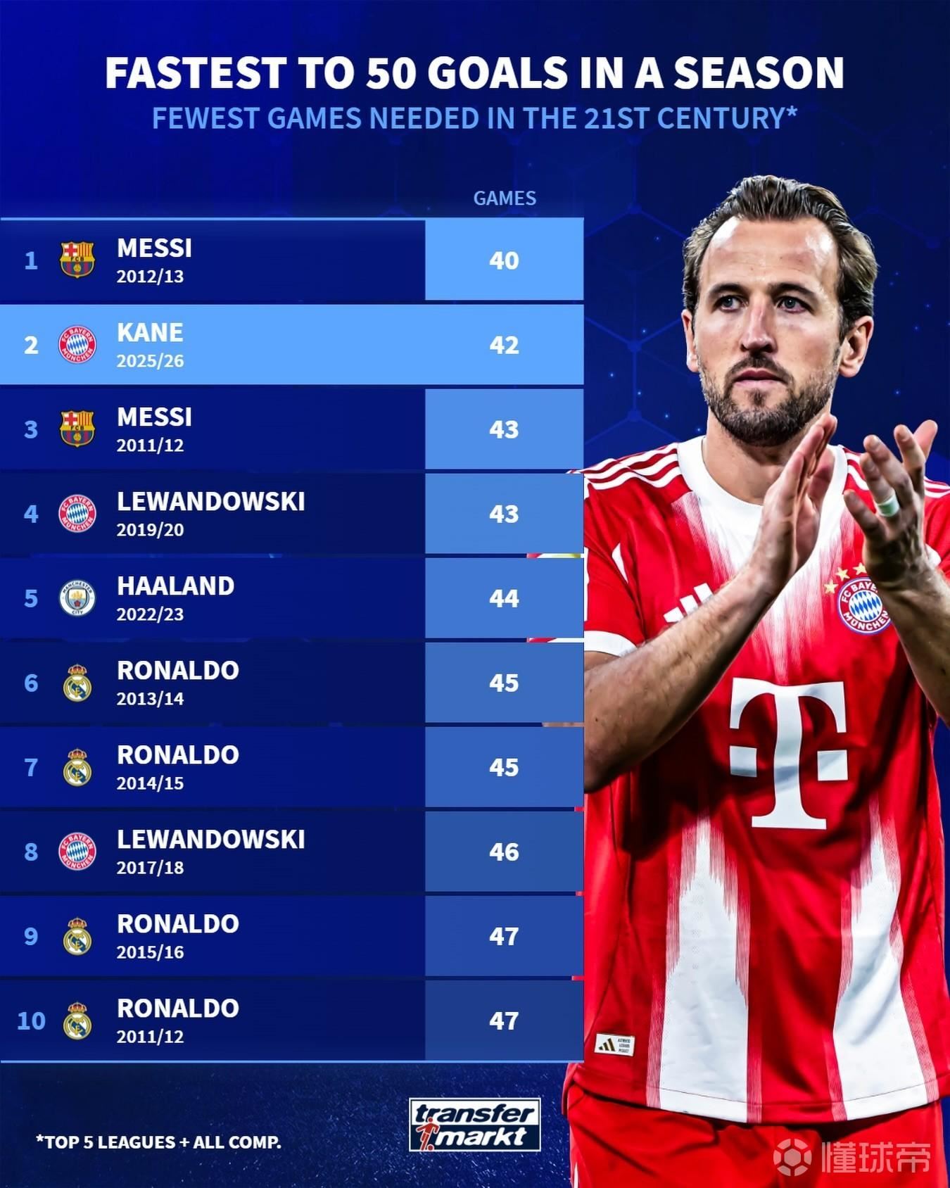 在与皇马的欧冠比赛中打入一球后,凯恩本赛季各项赛事已打入50球,仅用了42场,本世纪五大联赛中仅次于2012-13赛季的梅西。
