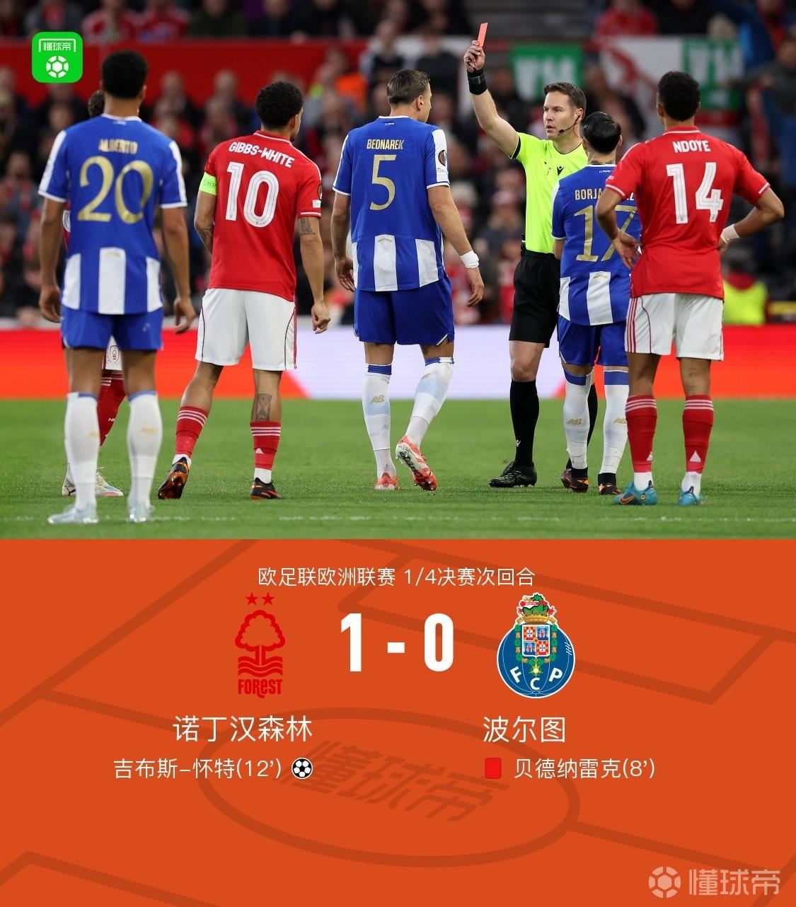 北京时间4月17日欧足联欧洲联赛 1/4决赛次回合,诺丁汉森林对阵波尔图。诺丁汉森林吉布斯-怀特破门。最终比分诺丁汉森林 1-0 波尔图。两回合总比分诺丁汉森林2-1波尔图,晋级四强。