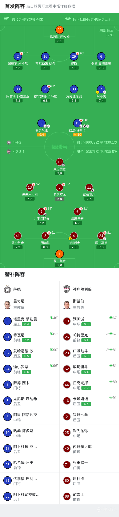 第90+3分钟,武藤嘉纪头槌破门绝平,双方进入加时,萨德3-3神户