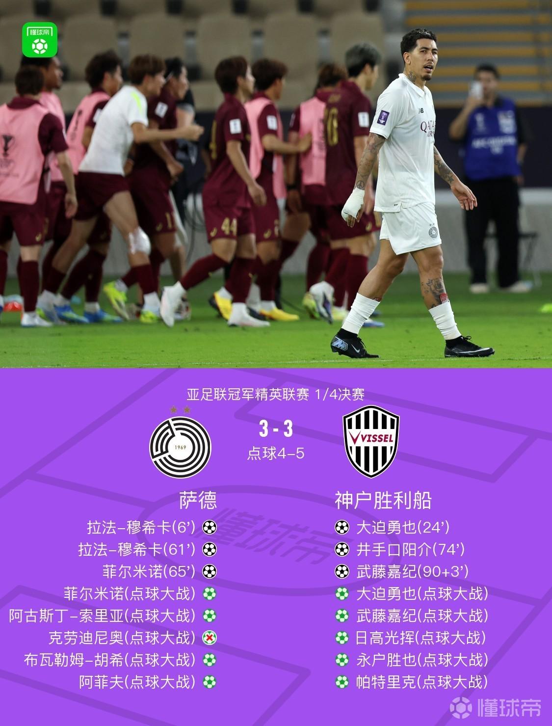 北京时间4月17日亚足联冠军精英联赛 1/4决赛,萨德对阵神户胜利船。上半场穆希卡闪击,大迫勇也扳平。下半场穆希卡梅开二度,菲尔米诺扩大比分,随后井手口阳介扳回一球,补时最后阶段武藤嘉纪绝平,双方90分钟战成3-3平进入加时赛,加时赛双方未能取得进球,进入点球大战。点球大战中克劳迪尼奥失点,最终神户胜利船总比分8-7逆转萨德晋级4强。