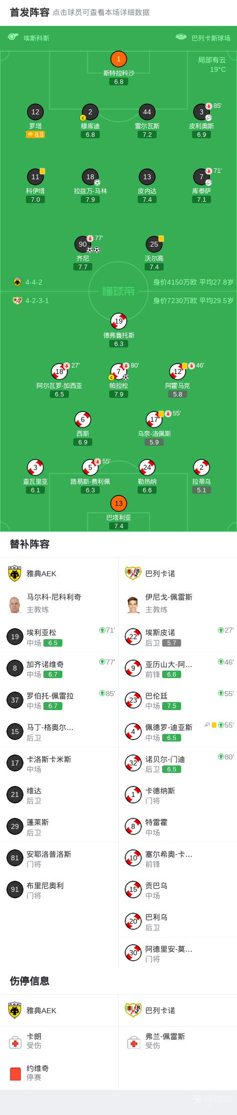北京时间4月17日欧洲协会联赛 1/4决赛次回合,雅典AEK对阵巴列卡诺。雅典AEK齐尼梅开二度,拉兹万-马林破门,一度将总比分追为3-3。巴列卡诺队帕拉松破门,攻入了关键进球。最终比分雅典AEK 3-1 巴列卡诺,两回合总比分雅典AEK3-4巴列卡诺,巴列卡诺队晋级四强。