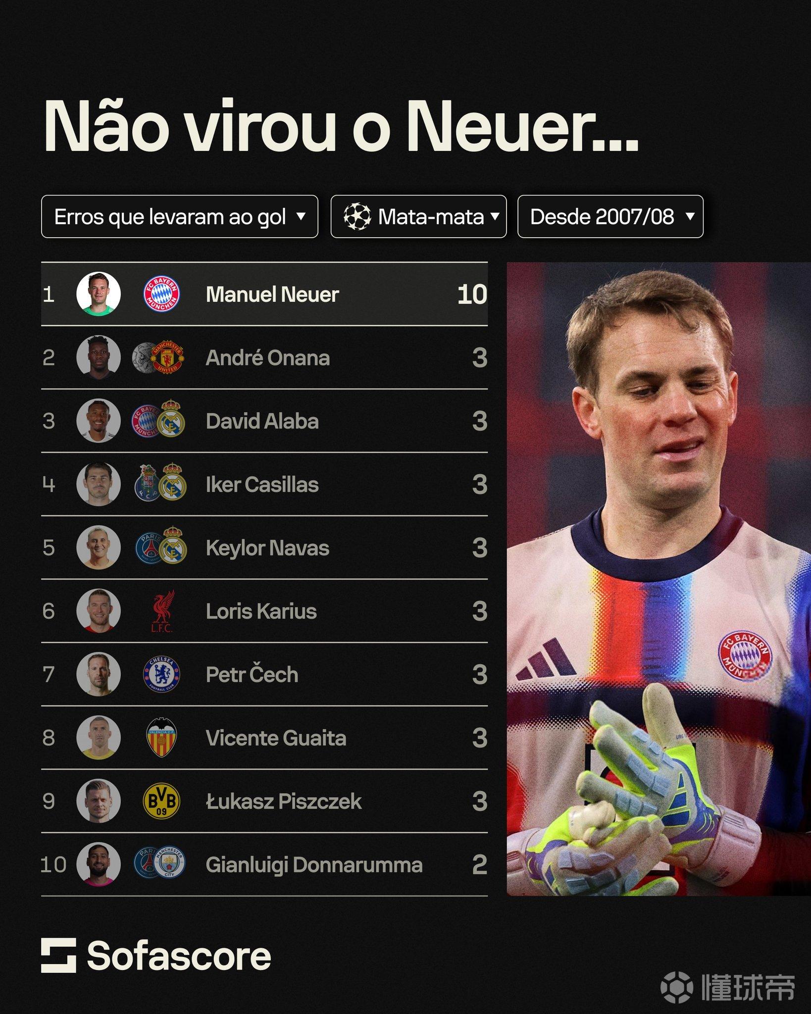 诺伊尔自欧冠首秀以来是淘汰赛因失误丢球最多的球员