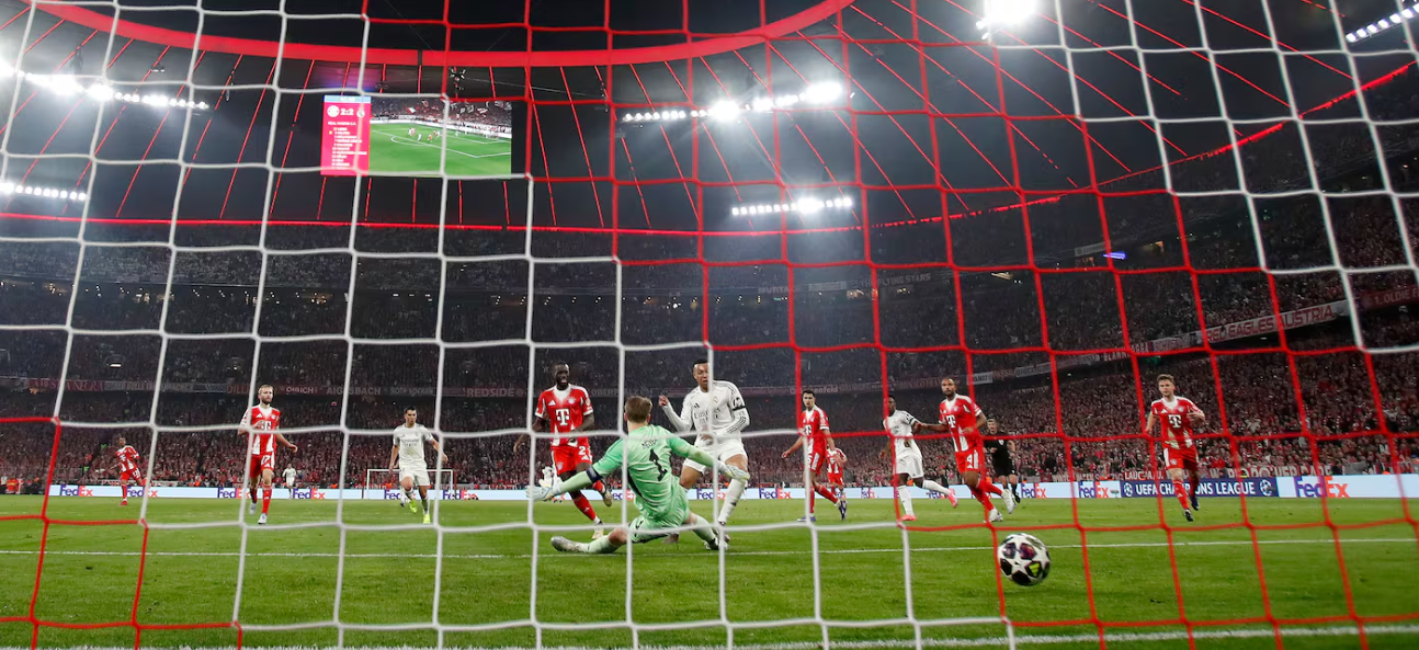 而第二个机会也被姆巴佩浪费了。他接到居莱尔的精妙直塞,单刀面对诺伊尔,但在德国后卫的干扰下,射门动作完全变形。比赛没有喘息的机会。拜仁几乎没有弱点。他们七十年的骄傲不会因为任何人或任何比分而改变计划。他们全力扑向皇马,坚信自己的进攻能弥补瓷器般脆弱的防线带来的任何失误。他们重新捡起了老习惯——用角球折磨对手,大多数都是内旋球,对卢宁来说简直是煎熬。