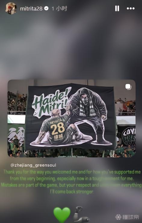 中超第6轮,浙江俱乐部绿城队主场0-0战平北京国安。比赛中,浙江绿魂球迷协会对此前被禁赛的米特里策进行了声援,在比赛中,他们举起了米特里策的Tifo。