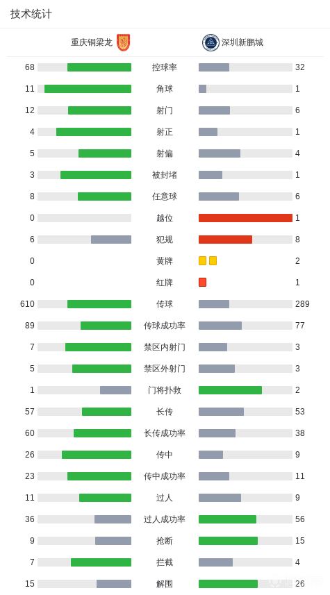 北京时间4月17日中国足球超级联赛第6轮,重庆铜梁龙主场对阵深圳新鹏城。陈纯新、向余望分别破门,本科维奇染红。最终比分重庆铜梁龙2-0深圳新鹏城。