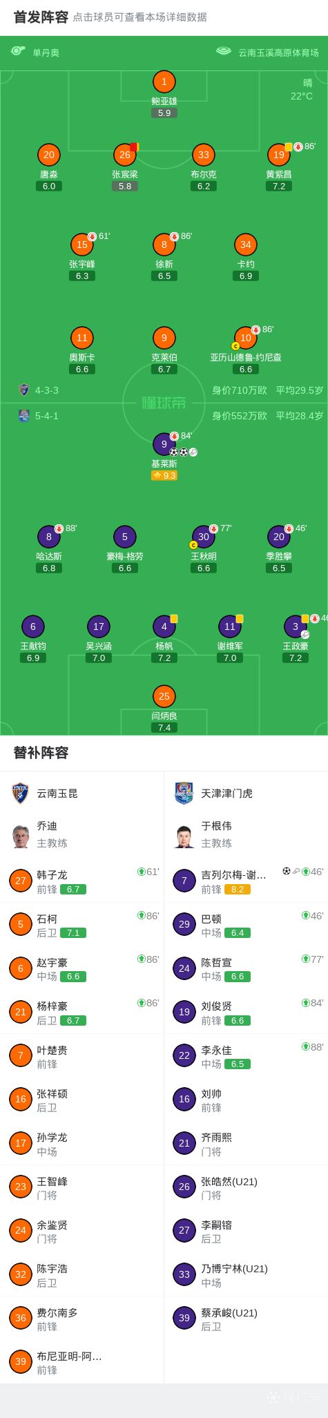 北京时间4月17日中国足球超级联赛 联赛 第6轮,云南玉昆主场对阵天津津门虎。上半场,王政豪助攻基莱斯破门将场上比分改写。下半场,基莱斯边路传中,谢蒂内倒地破门将比分扩大。张宸梁拉倒谢蒂内犯规,吃到第二张黄牌被罚下。谢蒂内助攻,基莱斯破门完成双响。最终,天津津门虎客场3-0战胜云南玉昆。