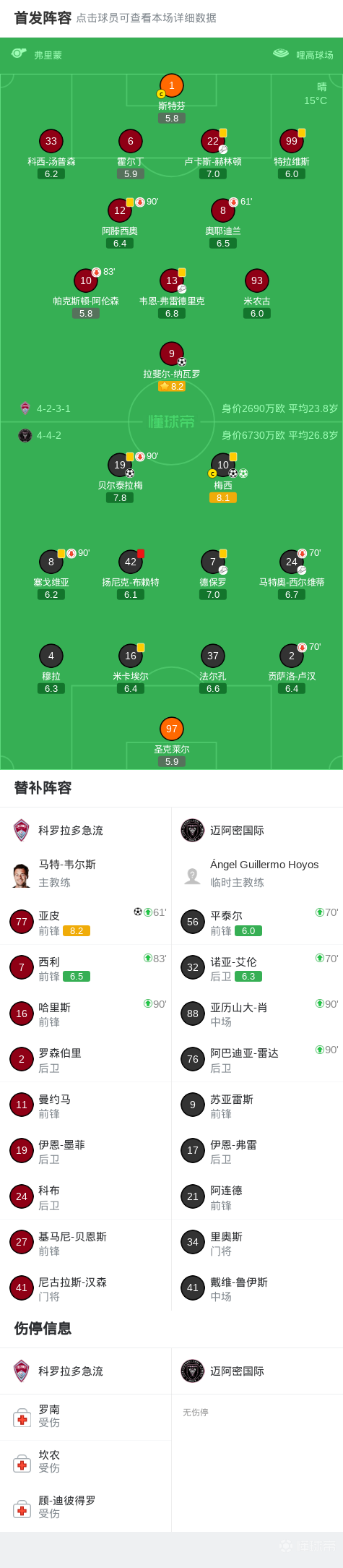 关键事件第18分钟,布赖特造点,梅西主罚点球命中,迈阿密国际1-0科罗拉多急流