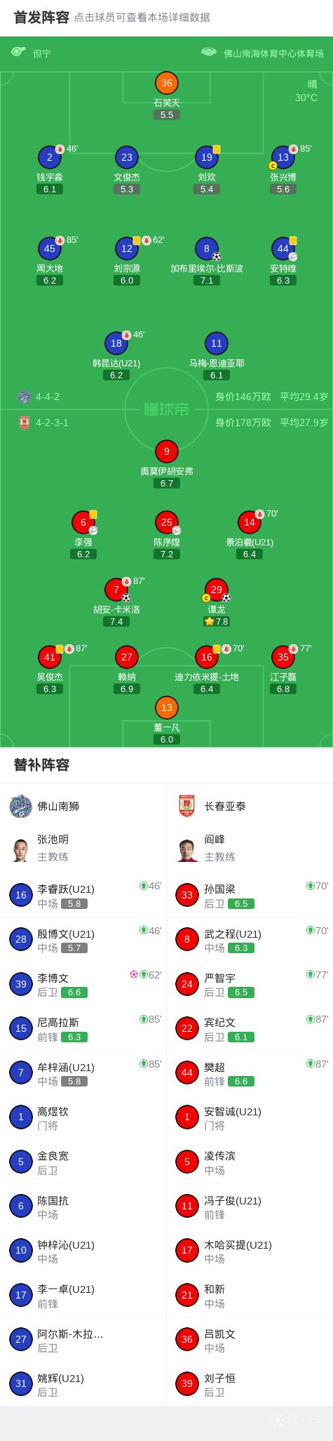 北京时间4月18日中国足球甲级联赛 联赛 第5轮,佛山南狮主场对阵长春亚泰。上半场卡米洛快发界外球,李强助攻谭龙破门。下半场安特维传中,比斯波破门,随后陈序煌直塞,卡米洛破门火速再度领先,之后李强传中,李博文自摆乌龙。最终亚泰3-1客胜佛山斩获3连胜。