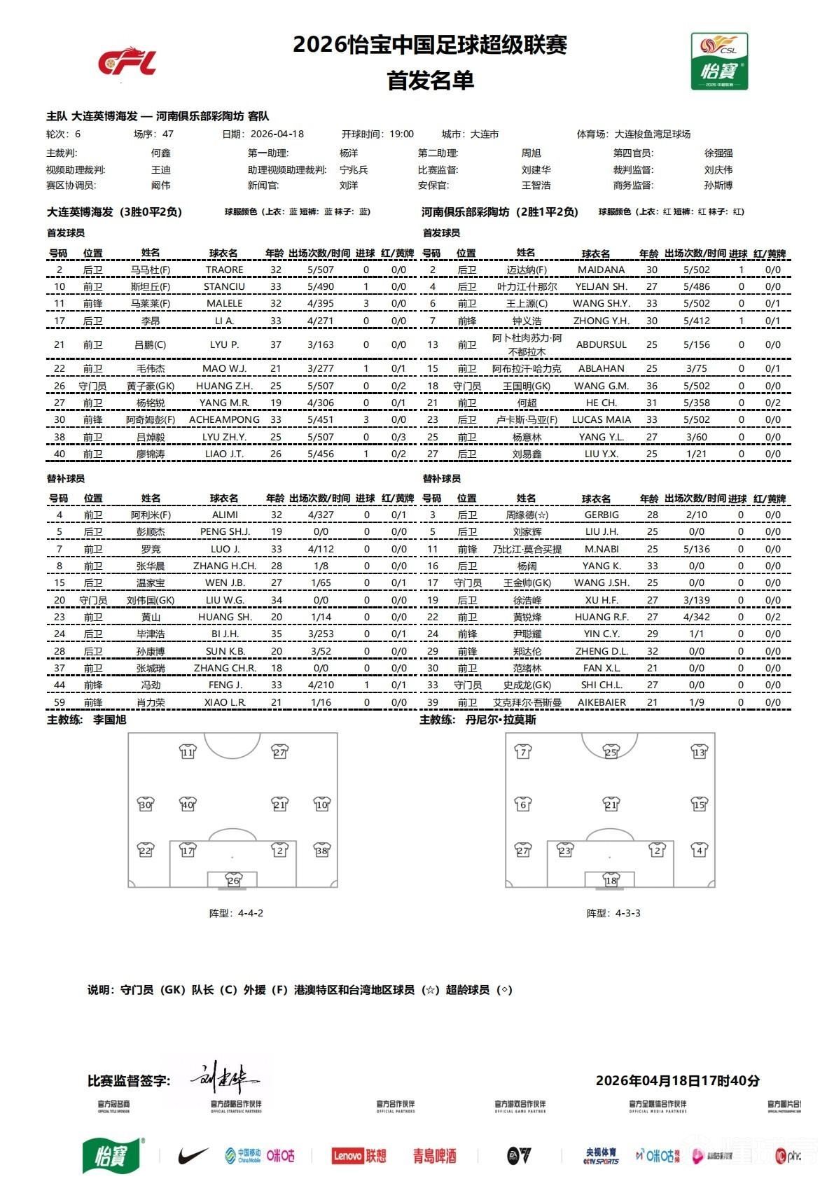 北京时间4月18日19:00,中超第6轮继续进行,大连英博坐镇大连梭鱼湾足球场迎战河南,本场主裁判为何鑫,VAR裁判为王迪,赛前双方首发出炉。