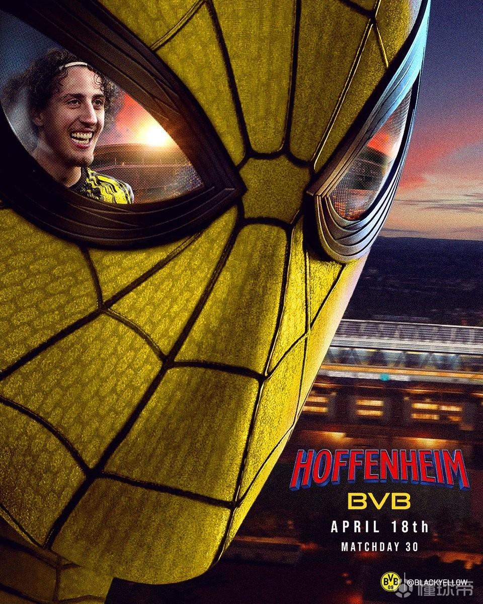北京时间4月18日,多特蒙德发布了德甲第30轮对阵霍芬海姆的赛前海报,主题为蜘蛛侠。