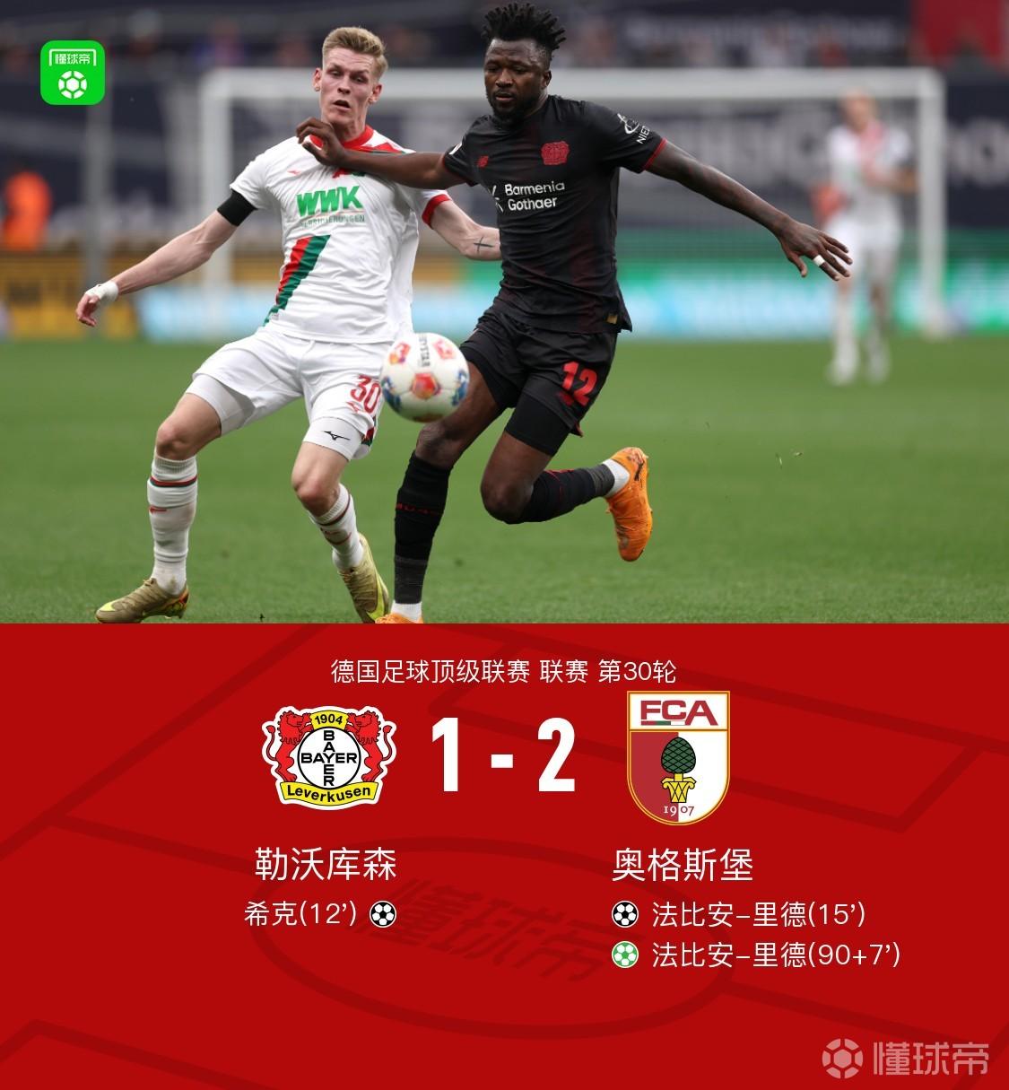 第90+7分钟,奥贡杜造点,法比安-里德点射破门,奥格斯堡2-1勒沃库森