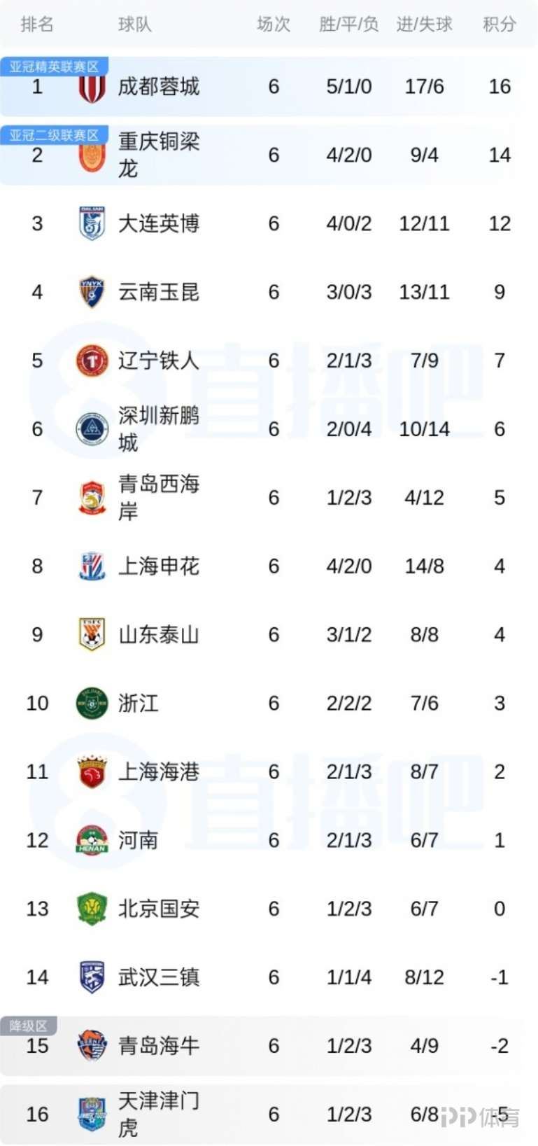中超第6轮结束,成都蓉城积16分领跑中超,重庆铜梁龙、大连英博分列二三,上海申花升至第8,武汉三镇、青岛海牛和天津津门虎仍然为负分。