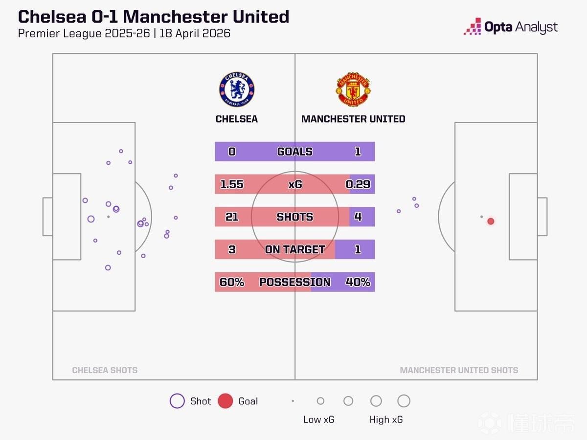 此役主场对阵曼联,切尔西完成21次射门,其中只有3次射正,而曼联完成4次射门,1次射正,打入全场唯一进球。