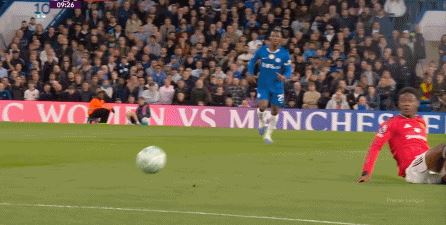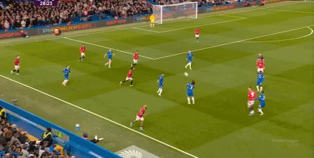 不过在刚开始的时候,这一切还不明显,毕竟刚登场的时候,加纳乔还在对位打右路,所以在第18分钟,切尔西几乎按照同样的线路再次打穿曼联的中场,内托送出的挑传,没能找到加纳乔: