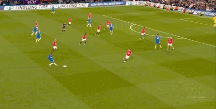 所以在中场休息的时候,罗塞尼尔应该是和队员强调了这一侧的机会,于是在下半场回来之后,切尔西能够继续切掉曼联的中场,从而开发出远射的空间: