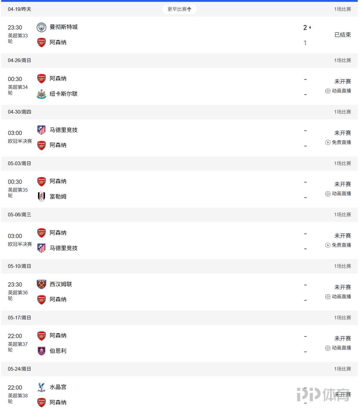 曼城少赛1场落后3分,曼城与阿森纳剩余的联赛赛程如图: