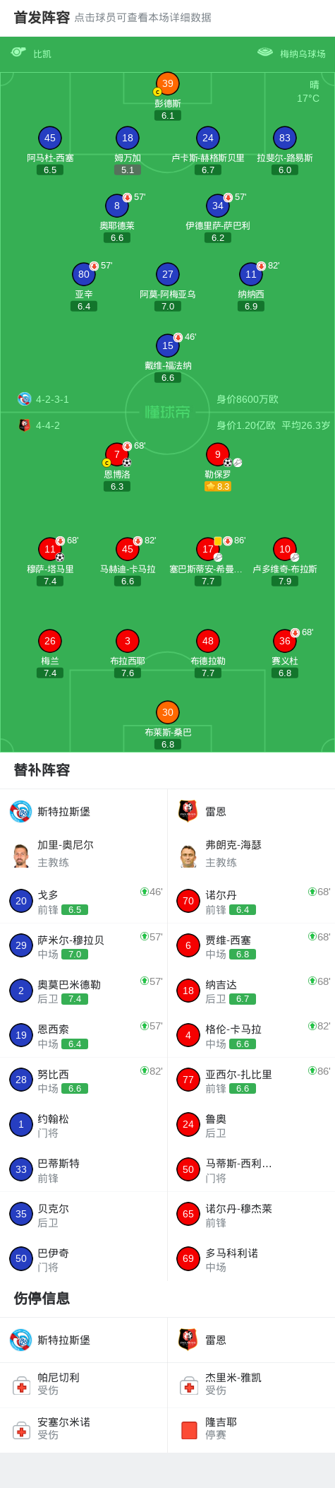 北京时间4月19日法国足球甲级联赛第30轮,斯特拉斯堡主场对阵雷恩。比赛中,勒保罗率先破门,随后恩博洛打入进球,穆萨-塔马里也完成得分。最终比分斯特拉斯堡0-3雷恩。