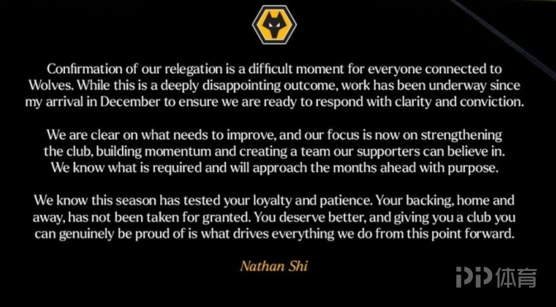 “确认降级对每一位与狼队息息相关的人来说,都是一个艰难的时刻。尽管这一结果令人深感失望,但自十二月我上任以来,我们已着手开展各项工作,以确保俱乐部能够清晰、坚定地应对当前局面。