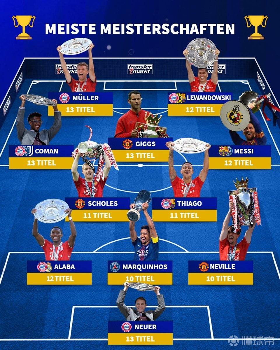 北京时间4月21日,德转统计出了欧洲五大联赛历史上夺冠次数最多的11人阵容,梅西领衔,托马斯-穆勒、莱万多夫斯基、吉格斯、诺伊尔上榜。