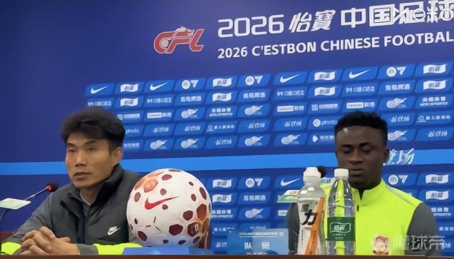 4月21日,中超联赛,青岛西海岸主帅郑智和球员阿齐兹出席了对阵河南队的赛前新闻发布会。