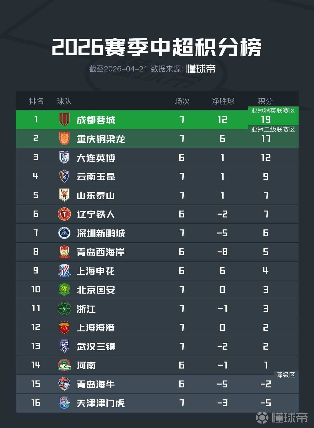 4月21日,中超第7轮先赛五场。川渝两队继续领跑积分榜,山东泰山在客胜天津津门虎后升至第五,国安升至第10,浙江队在一波四轮不胜后掉到了第11,三镇则成功将积分转正。