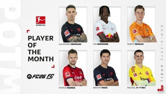 北京时间4月22日,德甲官方公布了4月最佳球员的候选名单,其中扬-迪奥曼德、格里马尔多、迈因卡、马扎、莫里茨-尼古拉斯、泽特尔在列。