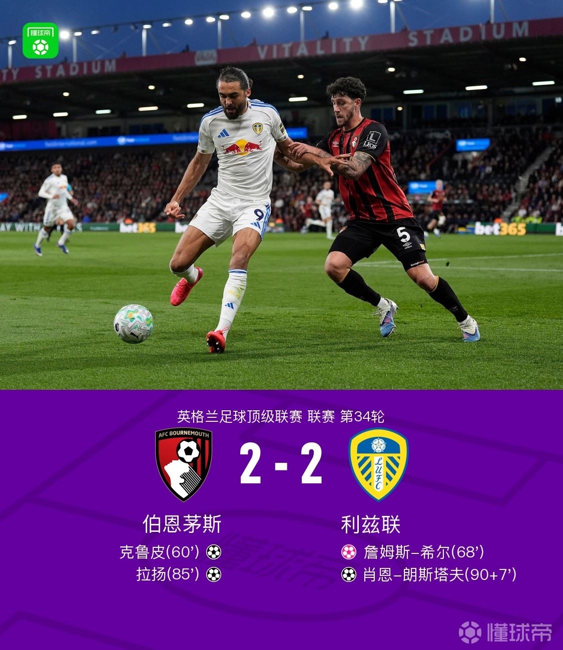北京时间4月23日英格兰足球顶级联赛 联赛 第34轮,伯恩茅斯主场对阵利兹联。伯恩茅斯克鲁皮破门,拉扬破门,詹姆斯-希尔自摆乌龙。利兹联肖恩-朗斯塔夫破门。最终比分伯恩茅斯 2-2 利兹联。